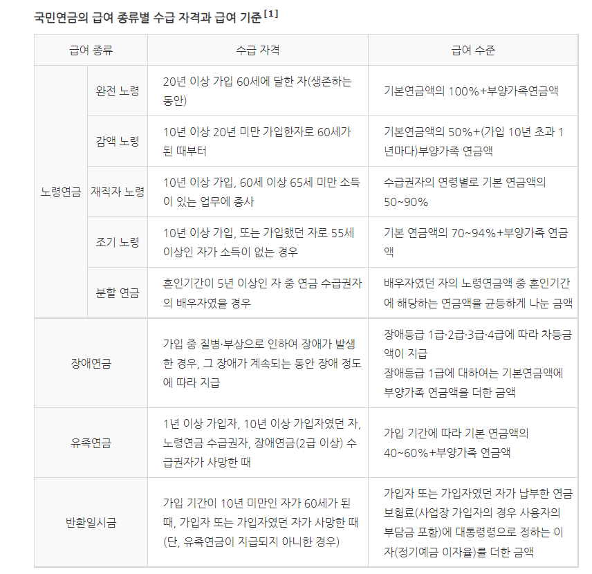 국민연금이란 나이가 들어 경제 활동을 하지 못하거나 질병으로 인해 소득이 없는 상황을 대비하여 정부가 운영하는 공적 연금제도입니다. 만18세 이상 만60세 미만 국민을 대상으로 실시하고 있습니다. 국민연금은 일반적으로 65세 이상부터 사망시까지 받는 노령연금 이외에도 장애연금, 유족연금, 반환일시금이 있습니다.