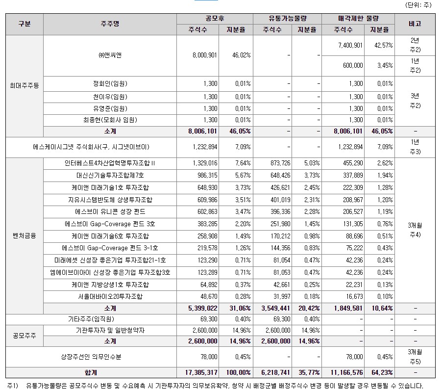상장 직후 공모주를 포함하여 넥스트칩 발행주식의 35.77%가 유통될 예정이며 상장 후 3개월 시점부터 유통 가능한 물량이 추가될 예정입니다. 상장 후 2년정도가 지나면 대부분의 물량이 유통가능하기 때문에 공모주 상장 이후에 주식을 보유하실 계획이 있으시다면 꼭 확인해주셔야 합니다.