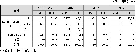 매출은 국내 13% 해외87%로 해외매출이 높은편이며, 매출에서 흉부 엑스레이 영상에서 10가지 흉부 이상소견을 검출할 수 있는 인공지능 솔루션 판독 의사를 보조하는 CXR이 41%이상을 차지하며 가장 큰 부분을 차지하고 있습니다.