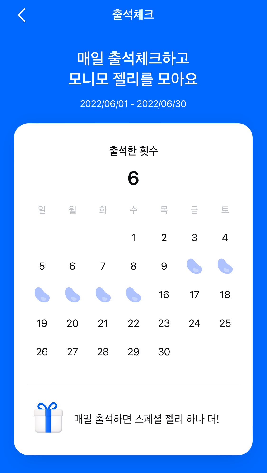 모니모 앱에 있는 금융 관련 서비스를 이용하면 젤리를 모을 수 있습니다. 금융상식도 쌓고 젤리도 모으고 1석 2조죠. 각각 미션을 완료하실때마다 젤리 1개를 받으실 수 있으시고요. 6미션을 모두 완수하신 경우에는 스페이셜 젤리를 받으실 수 있습니다.  단, 매일 진행되는 부분은 아니시고 1달에 1번 진행됩니다.