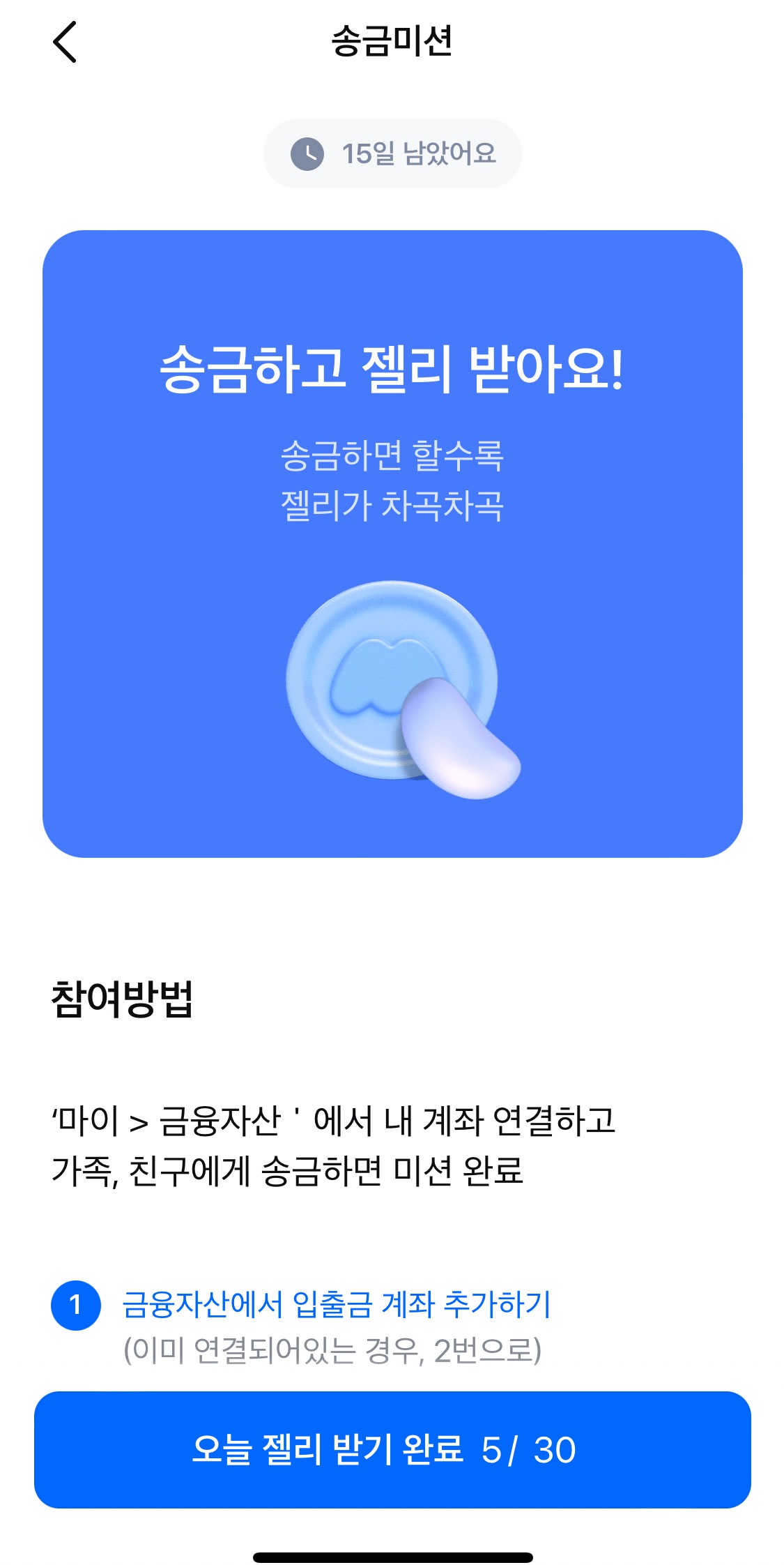송금하기를 통해서도 하루에 1젤리 한달에 30번 한도로 젤리를 받으실 수 있습니다. 금융자산에 원래 가지고 있던 계좌를 등록하시고 친구나 가족에게 송금하시면 간단하게 미션을 성공할 수 있습니다. 친구랑 밥먹고 더치페이하거나 송금이 필요하신 경우 모니모를 통해 송금하시고 젤리 1개를 받아보세요.