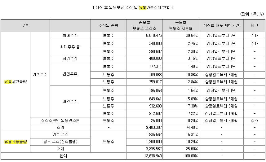 상장일 유통가능 물량은 전체 주식의 25.6%에 해당하는 3,235,562주입니다.