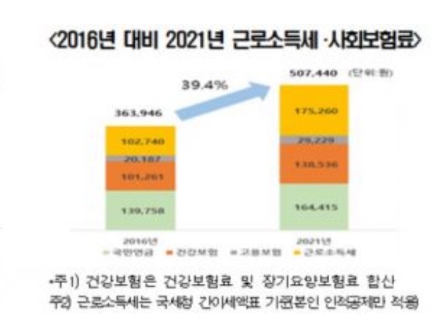 근로소득세 및 사회보험료는 5년간 39.4% 증가했다고 합니다. 근로소득세 및 사회보험료는 월급이 17.6%오른거에 비하해 2배넘게 증가했네요. 물가는 오르는데 월급이 안오르는 이유가 있었네요. 😭