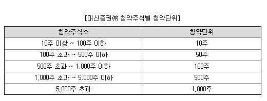 대신증권의 경우 청약단위 100주 이하(10주 단위), 500주 이하(50주 단위), 1,000주 이하(100주 단위), 5,000주 이하(500주 단위), 50,000주 이하(1,000주 단위), 5,000주 초과(1,000주 단위)입니다.