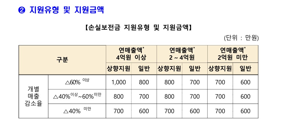 상향지원유형의 경우 국세청 부가세 신고 매출액이 2019년 대비 2020년 또는 2019년 대비 2021년에 40%이상 감소한 50개 업종에 대해 매출규모 및 매출감소율에 따라 총 9개 구간으로 구분하여 700만원, 800만원 또는 1,000만원을 지급받으실 수 있습니다.