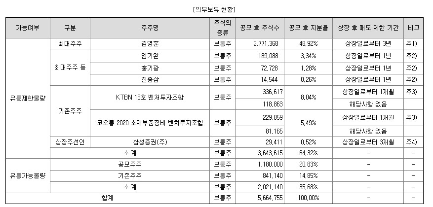상장 당일 유통가능물량은 2,021,140주로 전체 주식의 35.68%입니다. 나머지 64.32%의 대부분 최대주주인 김영훈 대표가 가지고 있으며, 상장일로부터 3년간 유통이 불가능합니다.