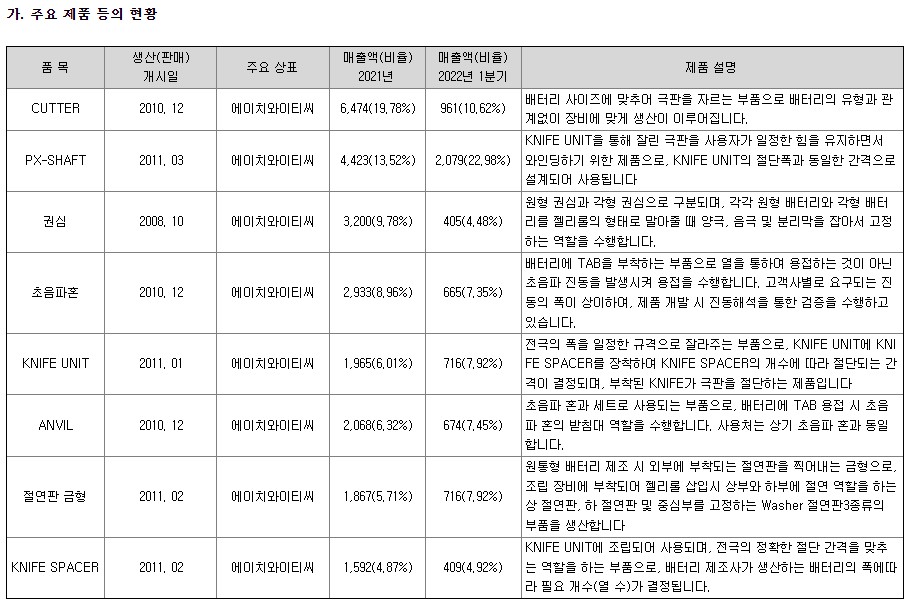 HYTC의 주요제품은 8가지로 각각 2차전지와 관련된 제품들입니다.