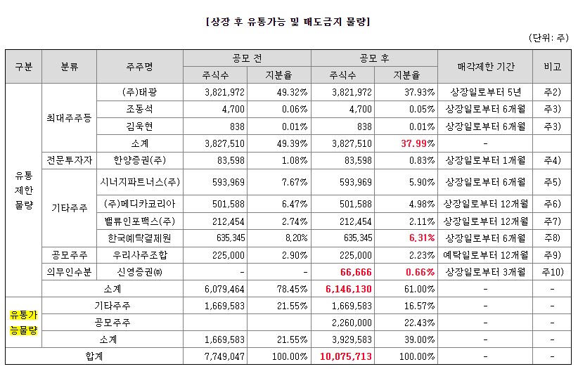 상장 당일 유통가능 물량은 39%이며 1개월 후 유통가능 물량이 추가적으로 풀릴 예정이니 매도, 매수때 참고해주세요.