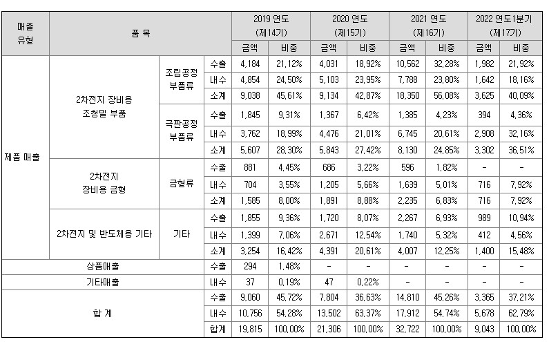 에이치와이티씨의 매출을 살펴보면 제품매출과 상품, 기타매출로 구성되어 있으며, 제품은 초정밀부품, 금형, 반도체용기타로 나눠져 있고, 초정밀 부품쪽의 비중이 가장 높습니다. 조립공정, 극판공정, 부품류를 모두 합치면 매출의 70%가 넘습니다. 총 매출은 연도별로 꾸준한 상승을 부여주고 있어 올해도 좋은 결과가 있지 않을까 싶습니다.