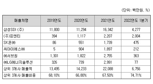 에이치와이티씨의 가장 큰 매출처는 삼성SDI와 피엔티입니다. 상위 3개사의 매출 비중은 총 매출의 70%정도를 차지하고 있습니다.