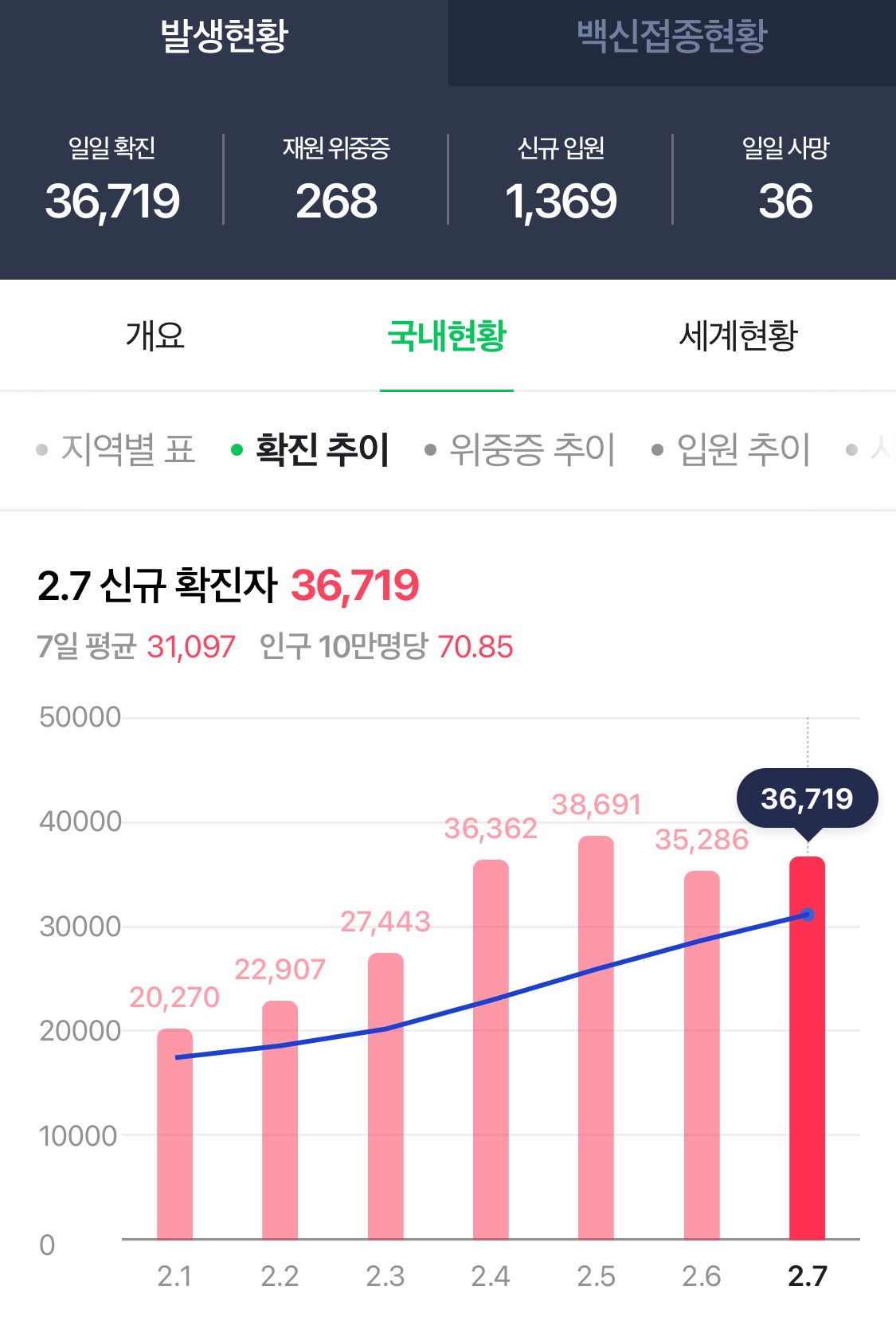 증가하고 있습니다. 2월 7일자 기준 1일 확진자수는 36,719명으로 4만명에 근접하는 신규 확진자가 발생했습니다.