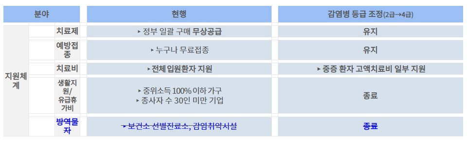 코로나19 치료제, 백신, 중증 환자의 입원 치료비 일부 등 고위험군 지원체계가 유지됩니다.