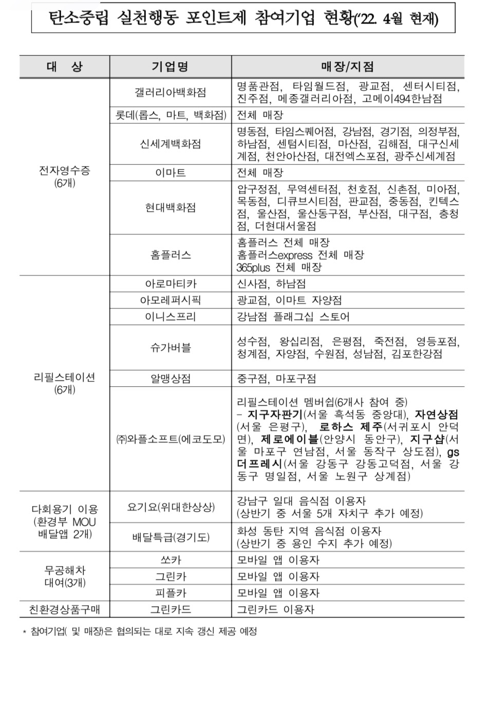 가입만 하셔도 5,000포인트가 적립되며, 전자영수증사용 1회당 100포인트, 리필스테이션 1회 이용시 2,000포인트, 다회용기 사용 1회당 1,000포인트, 무공해차 대여시 1회당 5,000포인트, 친환경상품 구매시 1회던 1,000포인트를 모으실 수 있습니다. 참여 기업은 각 활동마다 다르기 때문에 아래 사진을 확인해주세요.