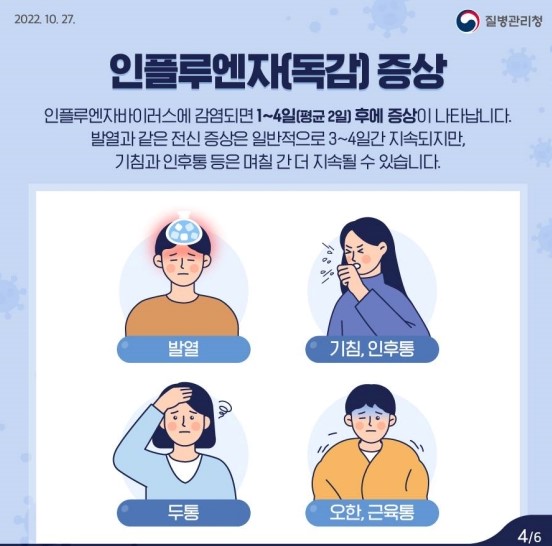 독감의 경우 감염되면 1~4일 후에 발열과 같은 전신 증상이 나타납니다.