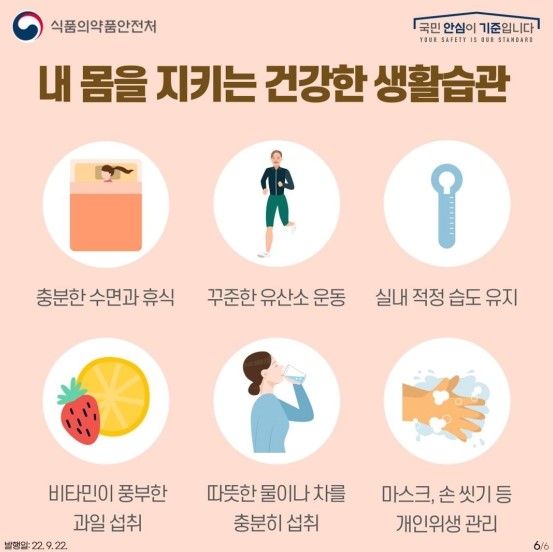 환절기 바이러스로부터 내 몸을 지키기 위해서는 충분한 수면과 휴식을 취하고, 꾸준하게 유산소 운동을 해야합니다. 또한, 실내 습도를 적정하게 유지하고 비타민이 풍부한 과일을 섭취하여야 합니다. 따뜻한 물을 충분히 섭취하고 손 씻기, 마스크 사용 등 개인위생을 철저하게 관리하면 감기나 독감을 예방하실 수 있습니다.
