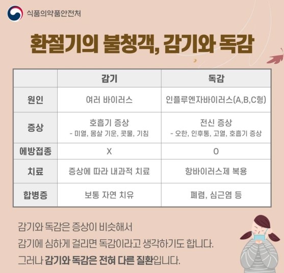 감기와 독감은 호흡기 증상이 나타나 비슷하게 느낄 수 있지만 전혀 다른 원인으로 발생합니다. 감기의 경우 여러가지 바이러스를 통하여 발생하지만 독감은 인플루엔자바이러스에 의해 발생합니다. 감기의 경우 대부분 자연적으로 치유가 가능하지만 독감의 경우 항바이러스제를 복용해야만 치유가 가능하며 합병증이 나타날 수 있습니다.