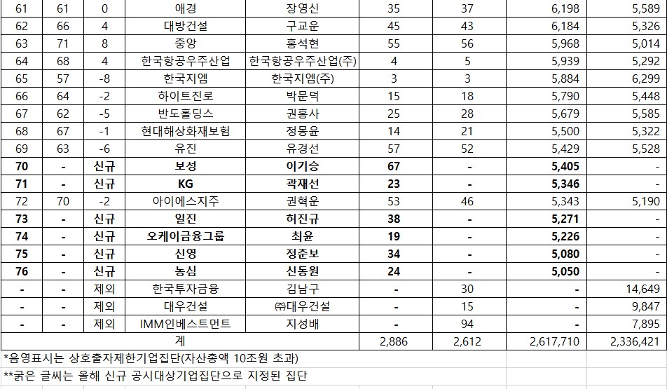 작년 71개의 대기업이 발표되었는데 이번년도에는 두나무, 크래프톤, 보성, KG, 일진, 오케이금융그룹, 신영, 농심이 포함되며 76개 대기업이 발표되었습니다. 추가된 기업은 8기업인데 왜 5기업이 늘었나 궁금하신 분들 있으실텐데요. 작년에 대기업으로 분류된 IMM인베스트먼트, 한국투자금융, 대우건설이 3기업이 빠졌기 때문입니다.