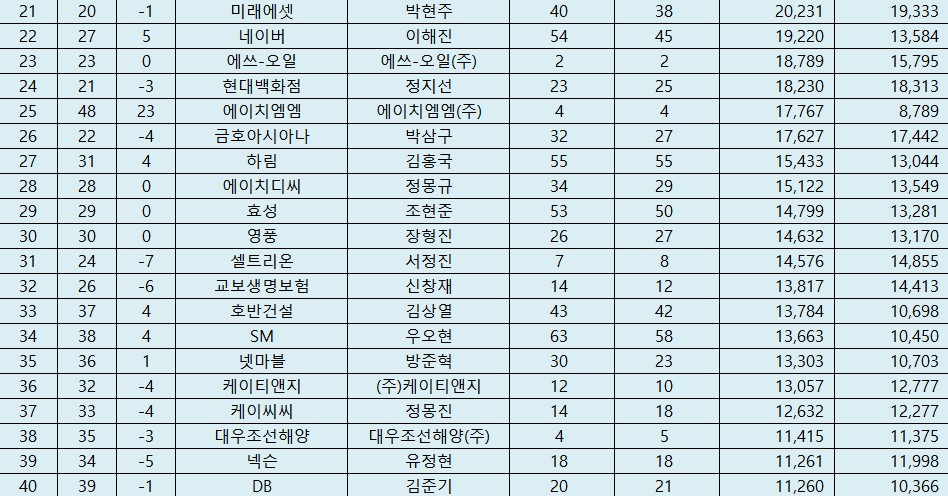 카카오, 네어버, 넷마블, 넥슨 등 정보기술(IT) 주력집단들은 꾸준한 성장세를 유지하고 있으며, 작년 대비 자산총액이 크게 증가하였습니다. 카카오의 자산총액의 경우 2016년도 5.1조원에서 2022년도 32.2조원으로 증가하였으며 자산총액 순위도 6년만에 50단계 급등하여 15위가 되었습니다. 네이버도 2017년 자산총액 6.6조원에서 19.2조원으로 증가하면서 5년만에 51위에서 22위로 29단계 급등하였습니다.