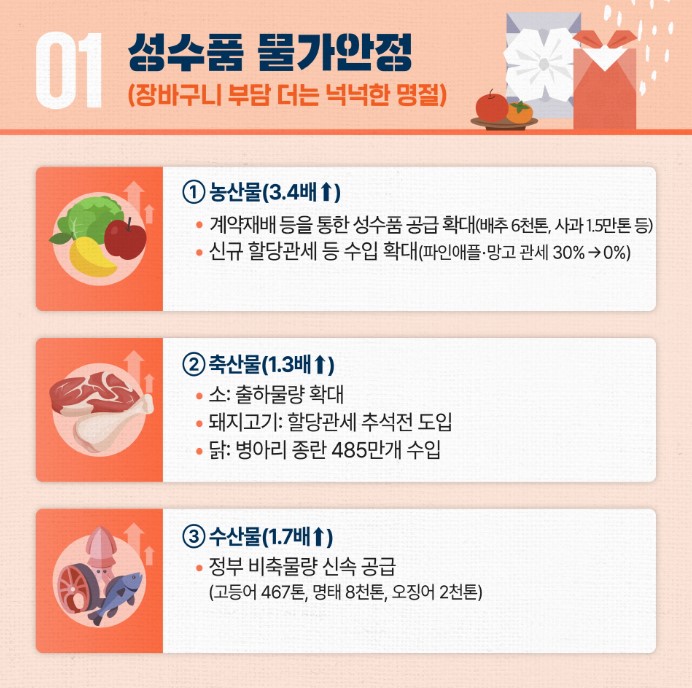 배추 6천톤, 사고 1.5만톤 등 계약재배 등을 통하여 성수품 공급을 확대하고 파인애플, 망고 등 신규 할당관세 등 수입을 확대합니다.