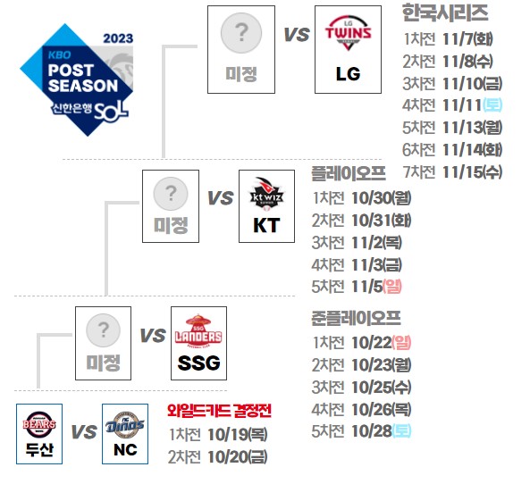 2023 KBO 포스트시즌 경기 일정은 2023.10.19(목) 와이트카드 결정전을 시작으로 시작합니다. 경기 일정의 경우 KBO 홈페이지를 통해 확인하실 수 있습니다.